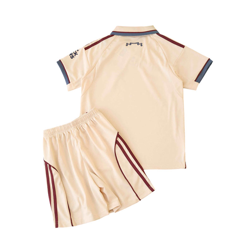 Opplev en unik stil med Ajax 2025/26 tredjedrakt for barn, et komplett fotballdrakt sett med trøye og shorts i den klassiske lyse beige fargen med elegante detaljer i mørkerød og marineblå. Denne drakten er laget for unge fans som ønsker å vise sin støtte både på banen og utenfor.