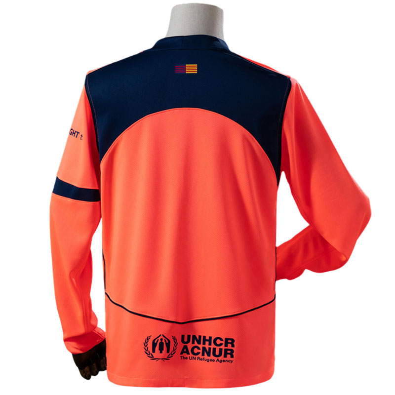 FC Barcelona herre fotballdrakt 25/26 – tredjedrakt i langermet versjon kommer i en frisk og energisk mango-farge kombinert med mørk marineblå detaljer, inspirert av stilen fra de ikoniske Total90-modellene fra tidlig 2000-tallet. Designet vekker også minner om klubbens historiske seks-trofé-sesong i 2009, der laget spilte i en lignende fargetone i finalen av klubb-VM.