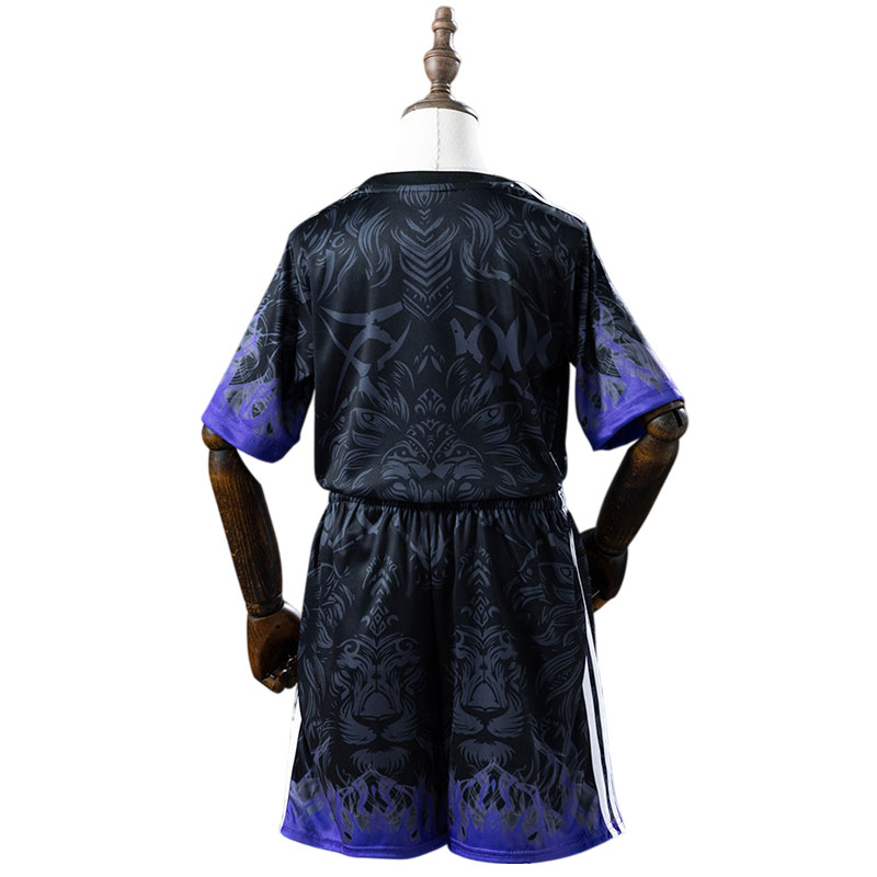 Utforsk Manchester United 25/26 spesialutgave barnesettet – et fotballutstyr som kombinerer klubbens tradisjon med et øyeblikkvis fangerende design. Settet har en svart base med dype lilla tonaler og et detaljert løve-mønstret over hele drakten. På høyre bryst finner du det ikoniske Manchester United-logoet, og «Snapdragon» sponsorskiltet gir den autentiske kamplook. Shortsene er svart med lilla avslutning og hvite striper, fullført med Ads-logoet.