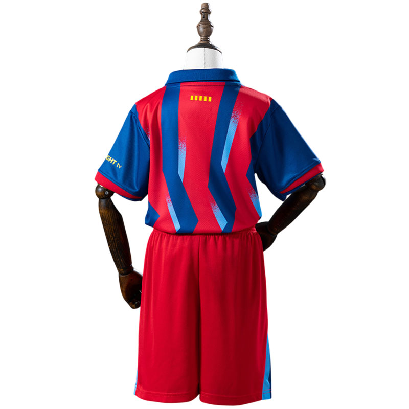 Denne Barcelona fotballdrakten for barn har et energisk design med blå og røde sikksakk-striper, kombinert med lyseblå grafiske detaljer som gir et moderne uttrykk. Fargekombinasjonen i blått, rødt og gult gjør drakten både synlig og stilren – perfekt for barn som elsker laget og ønsker en billig fotballdrakt som ser flott ut både på banen og i hverdagen.