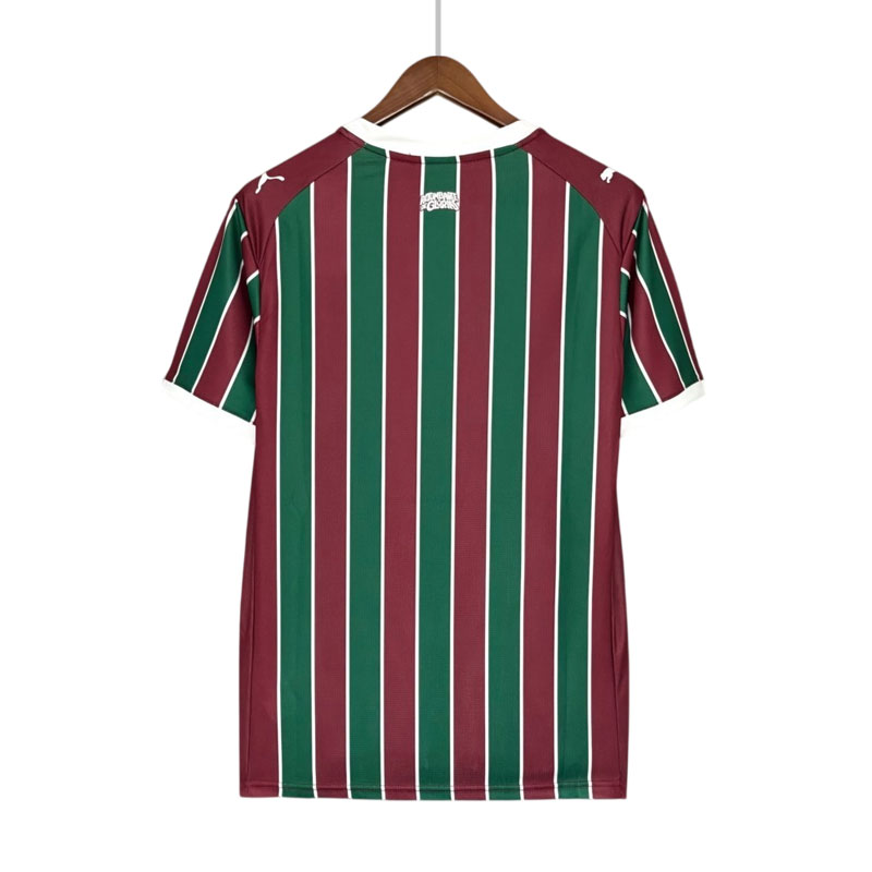 Fluminense hjemmedrakt 2026/27 for herrer viderefører klubbens klassiske trikolor-identitet med vertikale striper i vinrødt, grønt og hvitt. Stripemønsteret går sømløst over både front og rygg og gir drakten et tidløst uttrykk som er lett gjenkjennelig blant supportere. Den stilrene V-halsen og ermekantene er utført i hvitt og gir en fin kontrast til hovedfargene.