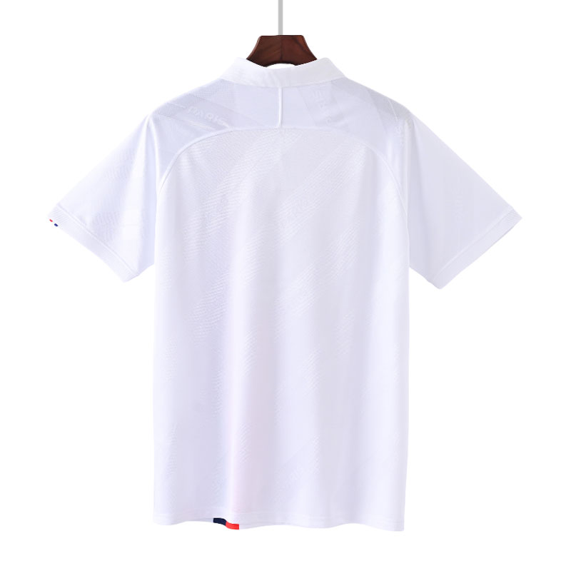 Drakten har en ren hvit base kombinert med en ikonisk rød-blå vertikal stripe langs venstre side, et klart nikk til et klassisk PSG-uttrykk. Kragen med knapper gir et sofistikert preg og gjør denne retro tredjedrakten like egnet til hverdagsbruk som til kampdag.
