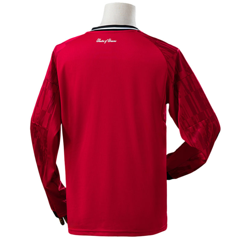 Manchester United 2025/26 herre hjemmedrakt – langermet rød fotballdrakt inspirert av Old Trafford, kjent som “Theatre of Dreams”. Denne Manchester United drakten har et moderne design med tonale røde mønstre på ermene som symboliserer banen og tribunene på klubbens legendariske stadion. Detaljer i svart og hvitt på krage og ermer gir et elegant uttrykk, mens klassiske skulderstriper og tydelig klubbemblem gjør den perfekt for enhver supporter.