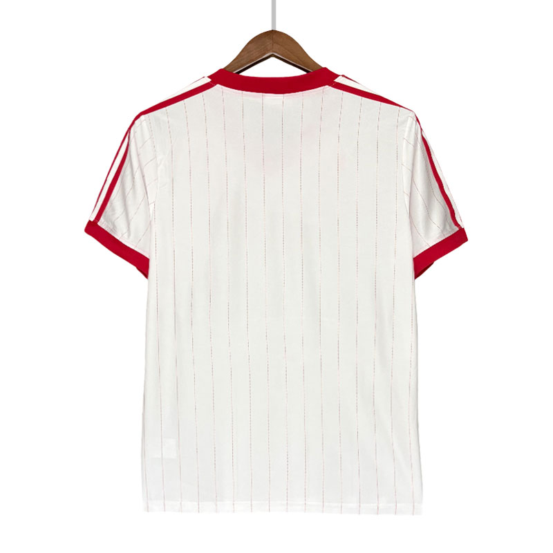 Den klassiske Polen 1982 drakt har en ren hvit base med diskrete røde pinstriper som gir et autentisk retro preg. De røde detaljene på V-halsen, ermekanter og de karakteristiske stripene på skuldrene skaper en stilren kontrast som gjør denne hjemmedrakt fotball lett gjenkjennelig. Designet kombinerer enkelhet og historie, noe som gjør den til et populært valg blant dem som søker en klassisk fotballtrøye herre.