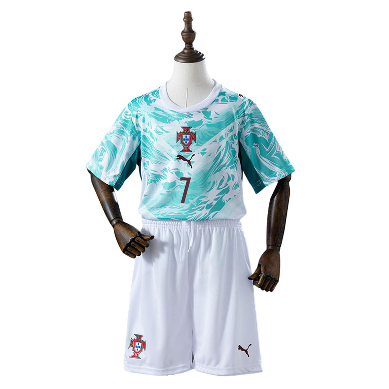 Portugal 2026/27 bortedrakt barn Ronaldo 7 er et moderne og stilrent fotballsett barn som skiller seg ut både på banen og i hverdagen. Drakten har en hvit base med flytende turkise bølgemønstre, inspirert av Portugals sterke tilknytning til havet og landets historie med oppdagelsesreiser. Det dynamiske designet gir et friskt og energisk uttrykk som gjør dette til en populær Portugal fotballdrakt 2026.