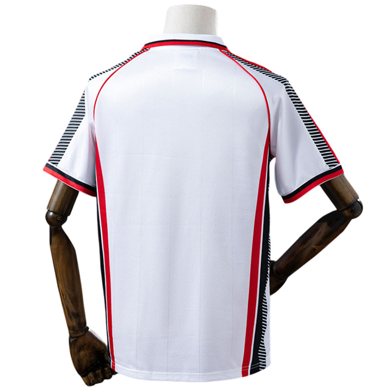 Retro AC Milan 1997/98 bortedrakt for menn tar deg tilbake til en dramatisk æra i klubbens historie. Denne hvite drakten med svarte og røde detaljer ble brukt i sesongen da Fabio Capello vendte tilbake til San Siro for å gjenoppbygge laget etter et utfordrende år. Selv om resultatene ikke levde helt opp til forventningene, står denne sesongen igjen som et symbol på kampvilje og lidenskap som kjennetegner AC Milan.
