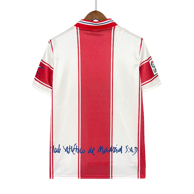Atlético Madrid retro drakt 99/00 hjemmetrøye er et perfekt valg for deg som elsker klassisk fotballstil. Denne ikoniske fotballdrakt for menn har de tradisjonelle røde og hvite vertikale stripene som kjennetegner klubben, kombinert med en stilren krage i rødt med blå og hvite detaljer. De hvite ermene med røde mansjetter gir et autentisk retro preg, mens sponsorlogoen på brystet og ligamerket på ermet fullfører det klassiske uttrykket.