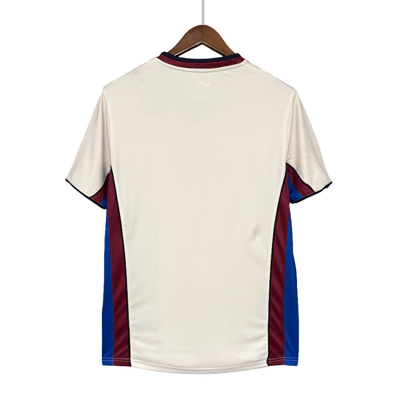 FC Barcelona Barcelona Retro Drakt 1998/99 – Bortedrakt Herre er en klassisk retro fotballdrakt som tar supportere tilbake til en av Barcelonas mest minneverdige sesonger på slutten av 90-tallet. Den lysegrå basen gir drakten et stilrent uttrykk, mens den karakteristiske V-halsen i mørkeblått med rød kant skaper en tydelig kontrast. Langs sidene av drakten løper røde og blå striper som fortsetter ut på ermene – et design som gir den ikoniske Barcelona drakt 1998/99 et dynamisk og gjenkjennelig preg.