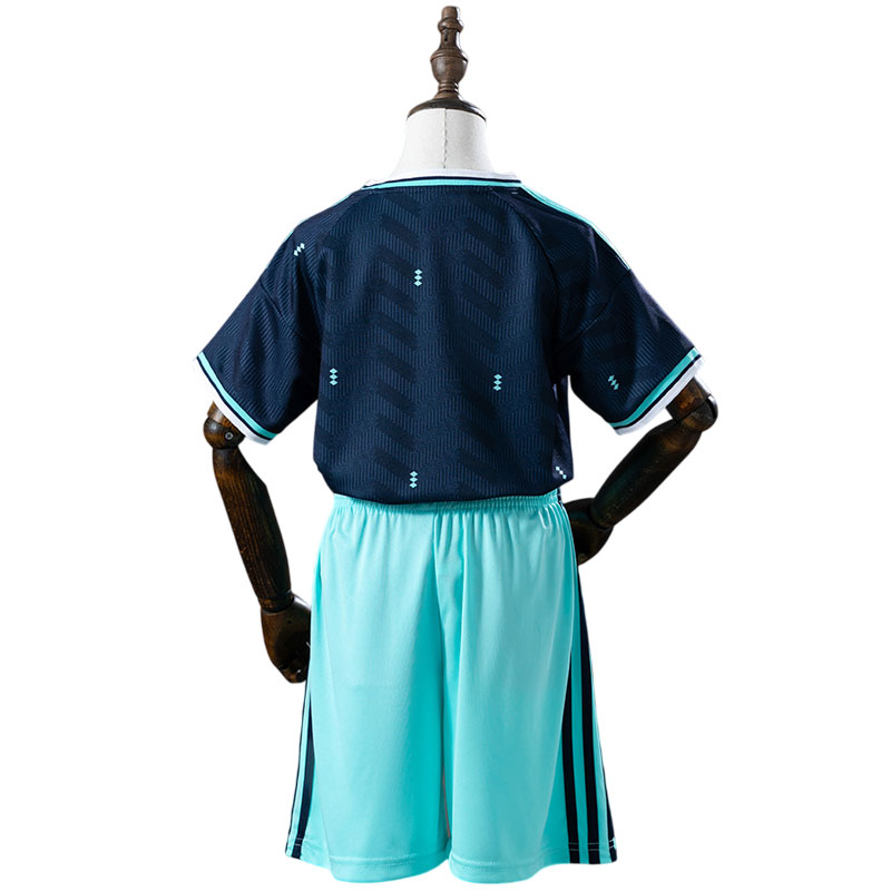 Gi små supportere ekte turneringsfølelse med Tyskland 2026 bortedrakt barn, et komplett VM fotballdraktsett med trøye og shorts som kombinerer moderne uttrykk og komfort. Drakten kommer i en dyp marineblå farge med hvite detaljer og friske mintfargede elementer som gir et tydelig og energisk preg. Det karakteristiske sikksakk-mønsteret og den tricolore kragen gjør designet ekstra iøynefallende for unge fans som følger Tyskland i VM.